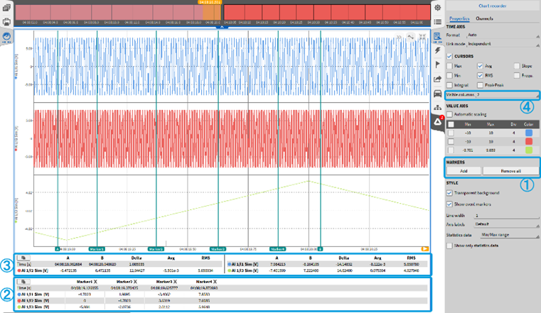 (Chart) Recorder Improvements: New marker functionality (up to 10 markers), customizable cursor table layout, to enhance analysis and reporting (see image below).