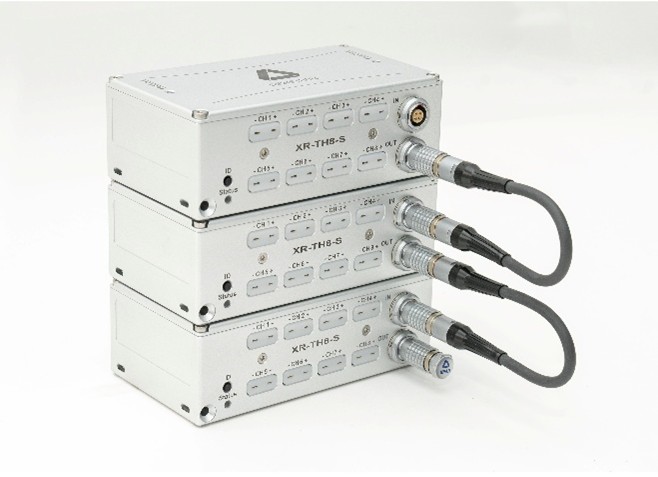 8 channel XR modules for universal thermocouple measurement and RTD temperature measurement, voltage and current all have CAN and RS-485 data output. This allows integration with Dewetron TRION and NEXDAQ systems and other measurement systems. XR modules can be daisy chained for higher channel counts (see image below).